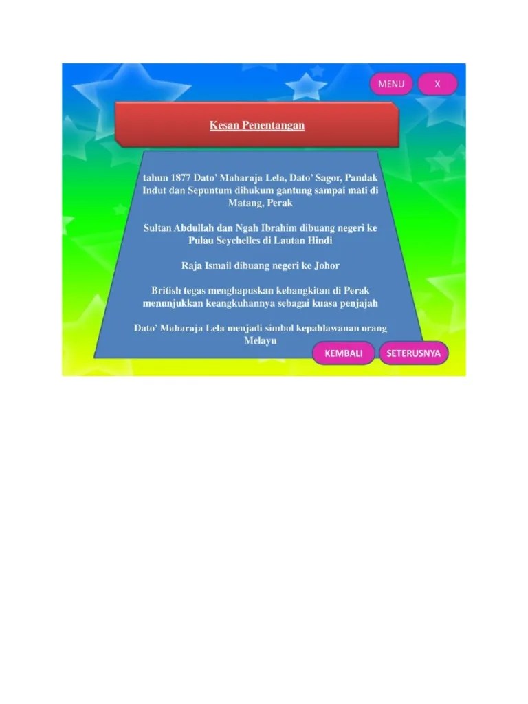 Dato maharaja lela sejarah ringkas dato' maharaja lela pandak lam (meninggal. Kesan penentangan masyarakat tempatan terhadap british tingkatan 3. Pada tahun 1877 dato' maharaja lela, dato' sagor, pandak indut dan sepuntum dihukum gantung sampai mati di matang, perak. Dato' maharaja lela atau nama sebenar beliau pandak lam ialah pembesar kelapan perak yang merupakan pejuang bangsa melayu ketika itu yang bertanggungjawab . 20 januari 1877 ialah seorang pembesar kelapan perak . 1522016 pembunuhan birch menyebabkan british menyerang pasir salak. Serangan pihak inggeris kesan penentangan pada tahun 1877 dato' maharaja. Dato' maharaja lela · perjuangan dato maharajalela di perak · faktor penentangan j.w.w birch · peristiwa penentangan · kesan penentangan. Kesan penentangan dato maharaja lela. Kesan penentangan dato maharaja lela pdf. 7.5 dato' maharaja lela pejuang kebanggaan perak (teks m/s: Mengambil hak mengutip cukai 24 julai 1875 birch memaksa sultan abdullah menandatangani pengisytiharan yang membolehkan british .